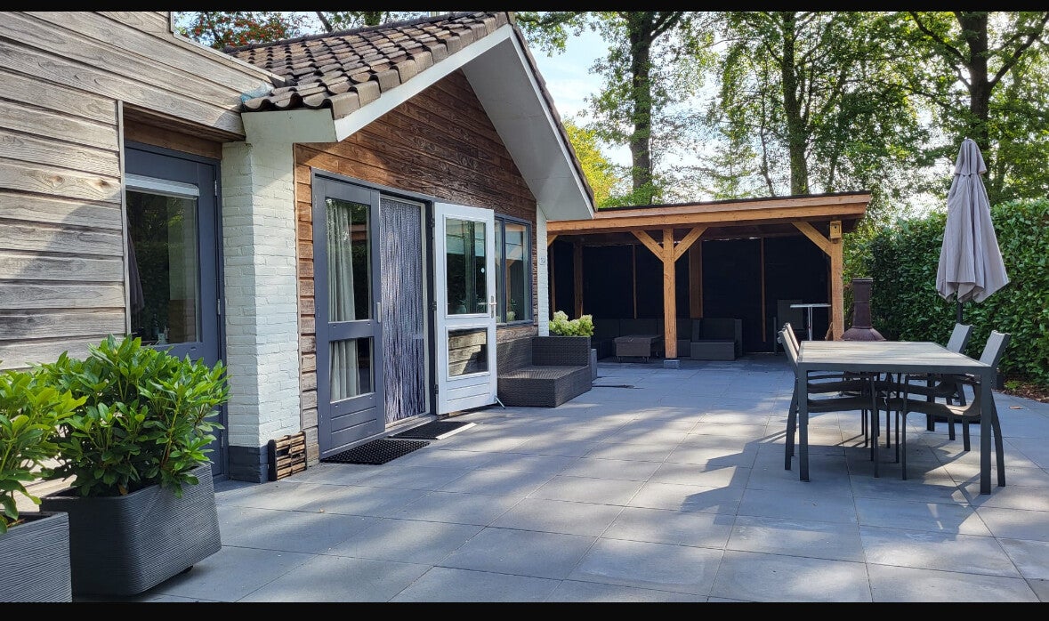 Op 't ruime terras kun je heerlijk in de zon zitten aan de tuintafel of je neemt plaats in de loungeset onder de overkapping.